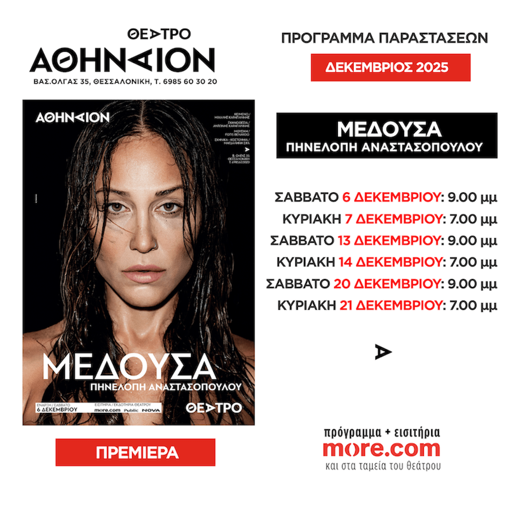 «ΜΕΔΟΥΣΑ» με την Πηνελόπη Αναστασοπούλου πρεμιέρα στις 6 Δεκεμβρίου 2025 Στο Θέατρο Αθήναιον Η πρεμιέρα για το θεατρικό έργο-μανιφέστο