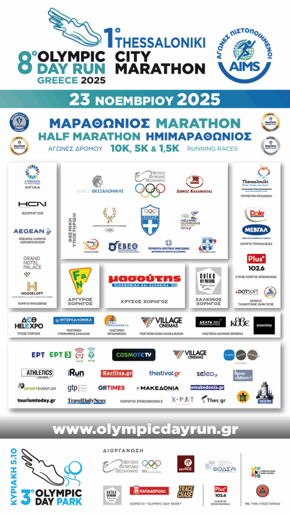 | ΗΘΕΣΣΑΛΟΝΙΚΗ ΣΤΟ ΕΠΙΚΕΝΤΡΟ ΤΟΥ ΠΑΓΚΟΣΜΙΟΥ ΔΡΟΜΙΚΟΥ ΚΙΝΗΜΑΤΟΣΤην Κυριακή 23 Νοεμβρίου, η καρδιά του παγκόσμιου θεσμού χτυπάει δυνατά στην Θεσσαλονίκη! Δίνουμε τον παγκόσμιο παλμό για τον εορτασμό της Διεθνούς Ολυμπιακής Ημέρας 2025!! Η διοργάνωση ορόσημο για το δρομικό κίνημα στην Ελλάδα, η μόνη που φέρει την υπογραφή της Διεθνούς και της Ελληνικής Ολυμπιακής Επιτροπής, σε περιμένει στη γραμμή εκκίνησης του 8ου “Olympic Day Run” και του 1ου Thessaloniki City Marathon!!ΓΡΑΦΟΥΜΕ ΜΑΖΙ ΙΣΤΟΡΙΑΤο mega sport event για την πόλη και την Ελλάδα, έχει ήδη καταρρίψει κάθε προηγούμενο ρεκόρ εγγραφών, με στόχο και την απογείωση του αριθμού συμμετοχών! Την δυναμική και ανοδική πορεία του θεσμού πλέον για την πόλη μας “Οlympic Day Run” θα συμπληρώσει φέτος το 1ο Thessaloniki City Marathon, ο 1ος Μαραθώνιος Πόλης στην χώρα, άλλος ένας παγκόσμιος θεσμός που έρχεται να συμπληρώσει ως δρομική εμπειρία το “Olympic Day Halfmarathon Run” σε μια υπέροχη πολιτιστική, αθλητική και τουριστική διαδρομή.Σε όλους τους δρομείς που θα συμμετάσχουν και θα τερματίσουν στους Αγώνες Μαραθωνίου, Ημιμαραθωνίου, 10Km, 5Km, 1,5Km θα δοθεί αναμνηστικό μετάλλιο και στους μικρούς μας φίλους, καθώς και αναμνηστικό δίπλωμα συμμετοχής από τη Διεθνή Ολυμπιακή Επιτροπή!! |