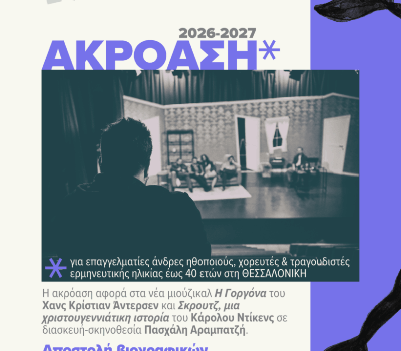 Ακρόαση από την Παιδική Σκηνή Θεσσαλονίκης για τις παραγωγές της σεζόν 2026-2027 Η Παιδική Σκηνή Θεσσαλονίκης ανακοινώνει