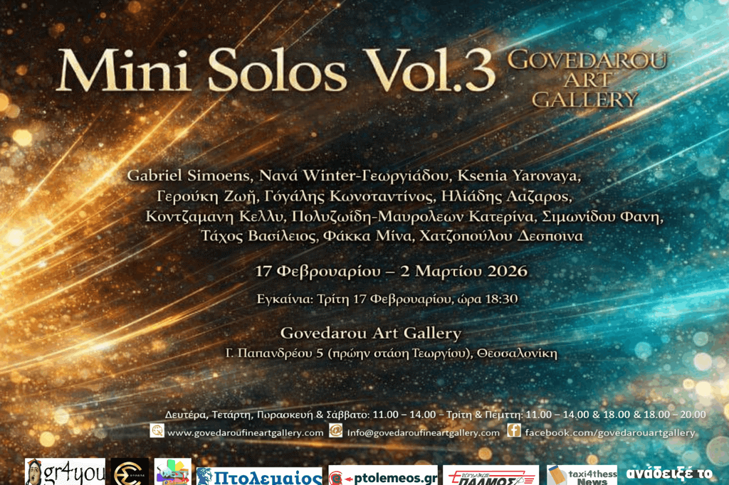 Η Govedarou Art Gallery παρουσιάζει στο χώρο της στη Γεωργίου Παπανδρέου 5(πρώην Ανθέων), την εικαστική έκθεση με τίτλο: “MINI SOLOS Vol.3”, την επιμέλεια της οποίας φέρει η εικαστικός και ιδιοκτήτρια της γκαλερί Νατάσα Γκοβεδάρου. Τα εγκαίνια της έκθεσης θα γίνουν την Τρίτη 17 Φεβρουαρίου 2026, ώρα 18.30 και θα διαρκέσει μέχρι 2 Μαρτίου.
