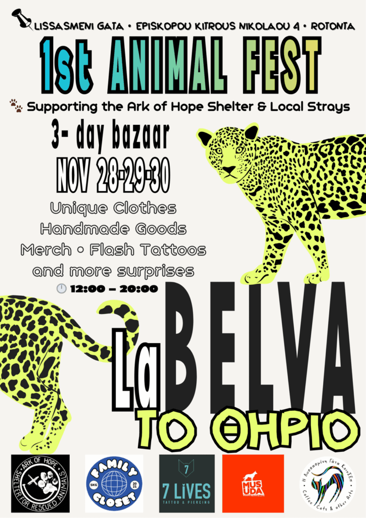 Το πρώτο Animal fest, με τίτλο La Belva – δηλαδή Το Θηρίο – έρχεται με ένα τριήμερο φιλοζωικό bazaar. Για τρείς μέρες γεμάτες shopping, δημιουργικότητα και αλληλεγγύη για τα ζώα. Από τις 28 έως τις 30 Νοεμβρίου, στο φιλόξενο Λυσσασμένη Γάτα Art Café οι επισκέπτες θα έχουν την ευκαιρία να ανακαλύψουν: