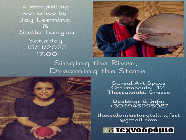 Σάββατο 15 Νοεμβρίου, 17:00-20:00: εργαστήριο αφήγησης (ελληνικά-αγγλικά) “Singing the River, Dreaming the Stone” με τον Jay Leeming και τη Στέλλα Τσίγγου.