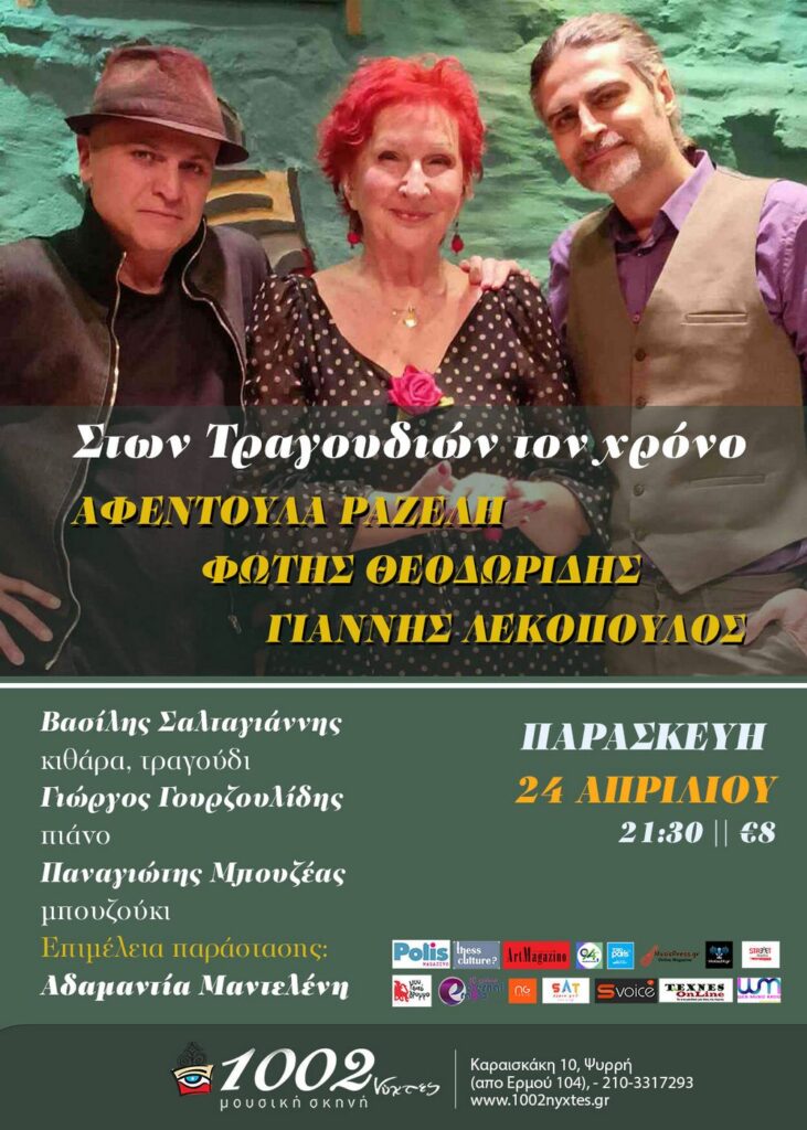 Την Παρασκευή 24 Απριλίου, στις «1002 Νύχτες» στου Ψυρρή, ανταμώνουν ξανά οι τρεις αγαπημένοι ερμηνευτές , Αφεντούλα Ραζέλη, Φώτης Θεοδωρίδης και Γιάννης Λεκόπουλος.
