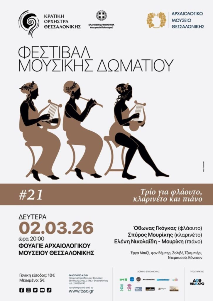 Το επιτυχημένο Φεστιβάλ Μουσικής Δωματίου που συνδιοργανώνουν η Κρατική Ορχήστρα Θεσσαλονίκης και το Αρχαιολογικό Μουσείο Θεσσαλονίκης, με την υποστήριξη του Υπουργείου Πολιτισμού, συνεχίζεται με τρεις σπουδαίους μουσικούς, τους Όθωνα Γκόγκα (φλάουτο), Σπύρο Μουρίκη (κλαρινέτο) και Ελένη Νικολαΐδη – Μουρίκη (πιάνο), που ενώνουν τις δυνάμεις τους σε ένα ποικίλο πρόγραμμα, με διασκευές διάσημων έργων, αλλά και πρωτότυπες δημιουργίες για το συγκεκριμένο συνδυασμό οργάνων.