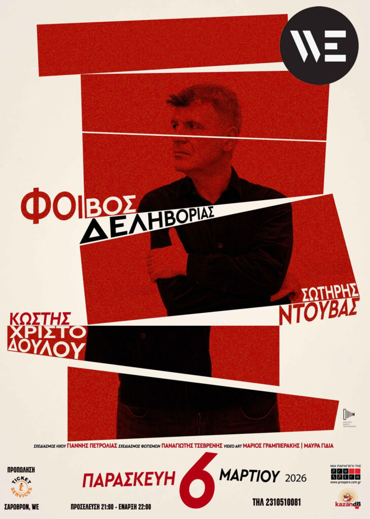 Φοίβος Δεληβοριάς“THREESOME” Παρασκευή 6 Μαρτίου 2026 WE – ΘΕΣΣΑΛΟΝΙΚΗΏρα προσέλευσης 21:00 – Ώρα έναρξης 22:00Προπώληση 17€ – Ταμείο 19€ |