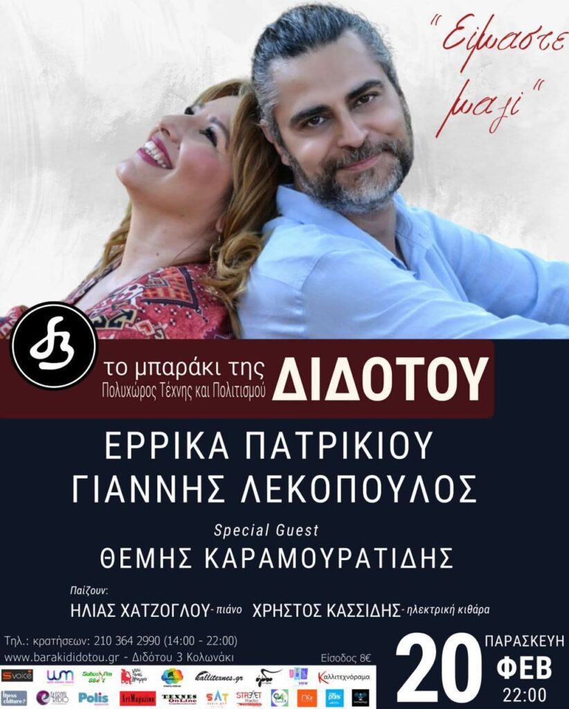 Η Έρρικα Πατρικίου και ο Γιάννης Λεκόπουλος συνεχίζουν και φέτος την επιτυχημένη τους συνεργασία και την Παρασκευή 20 Φεβρουαρίου ανταμώνουν στο Μπαράκι της Διδότου, έχοντας καλεσμένο τους τον Θέμη Καραμουρατίδη, έναν από τους σημαντικότερους σύγχρονους Έλληνες συνθέτες.