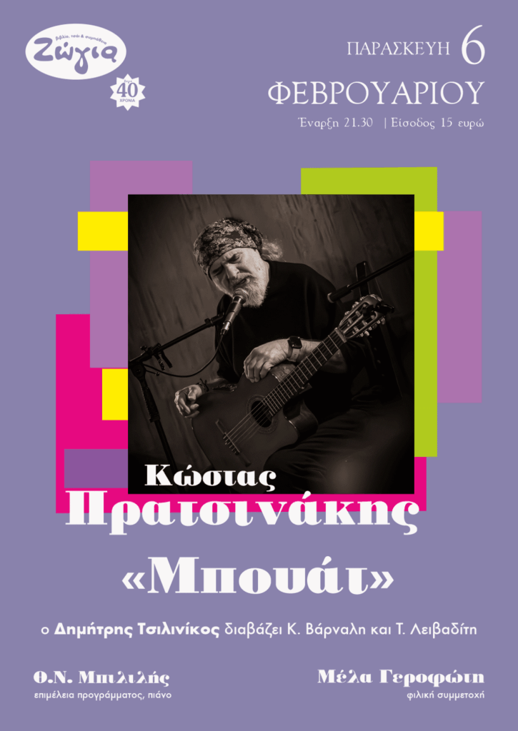 Ο σημαντικός έλληνας τραγουδιστής Κώστας Πρατσινάκης, παρουσιάζει στην Ζώγια, ένα πρόγραμμα – αναφορά στις “μπουατ”, στους χώρους – σύμβολα όπου μέσω της τέχνης, οι άνθρωποι μοιραζόντουσαν ιδέες και επικοινωνούσαν πολιτισμό.