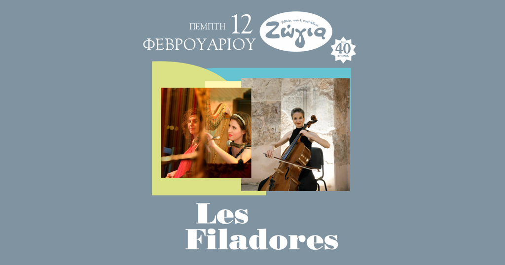 Η Ζώγια-Βιβλίο τσάι και Συμπάθεια, στις 12 Φεβρουαρίου 2026, μέρα Πέμπτη και ώρα 21:00 φιλοξενεί στο ζεστό της χώρο το μουσικό σχήμα “Les Filadores” (Τότα Κυριαζικιδου και Νάγια Μυσερλή) σε σύμπραξη με την βιολοντσελίστρια της Κρατικής Ορχήστρας Θεσσαλονίκης, Ιωάννα Κανάτσου. Θα ακουστούν παραδοσιακά τραγούδια του κόσμου διασκευασμένα από την Νάγια Μυσερλή για άρπα, τσέλο και δύο σοπράνο.