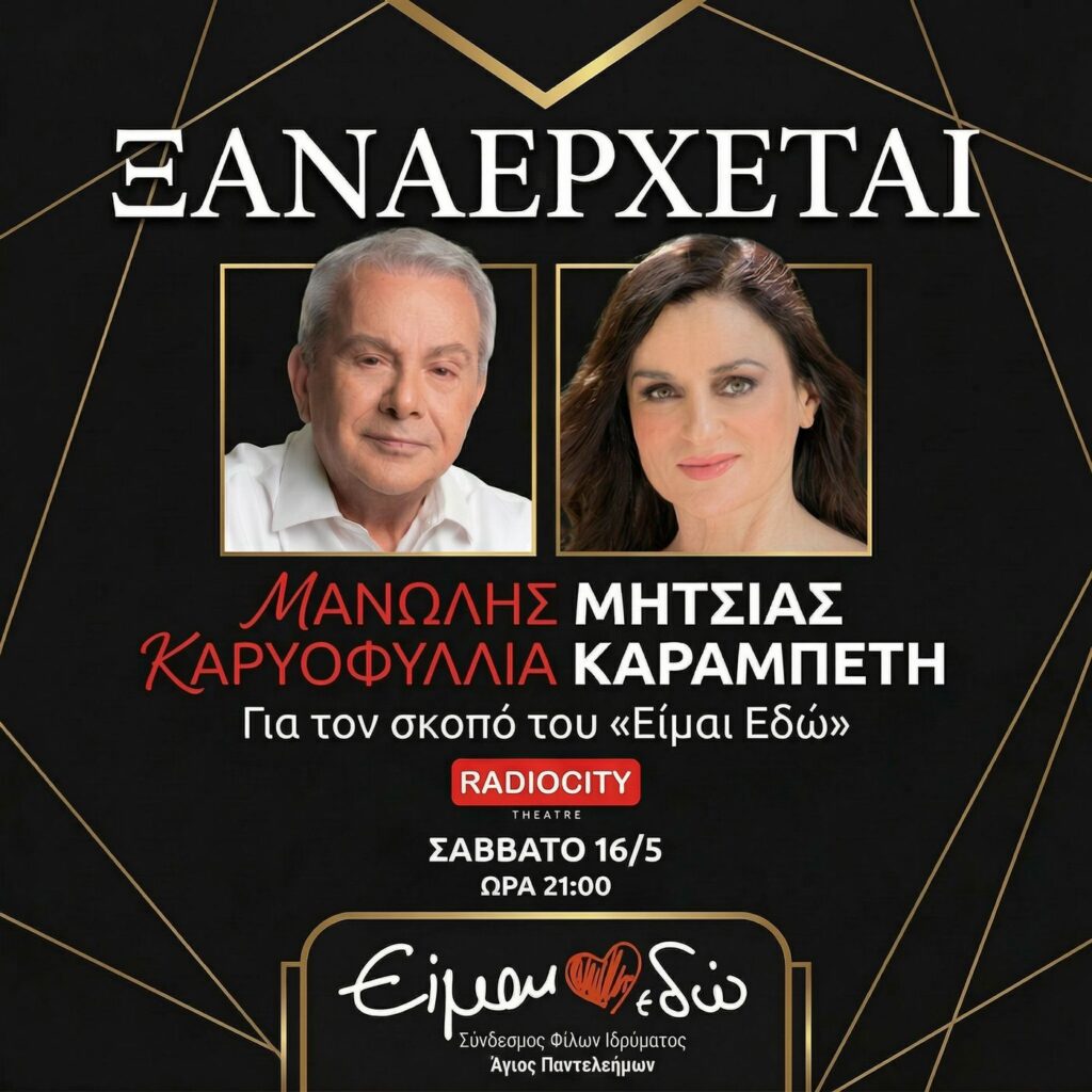Ο Μανώλης Μητσιάς συναντά επί σκηνής την Καρυοφυλλιά Καραμπέτη, σε μια ιδιαίτερη μουσική βραδιά στο Θέατρο  RADIOCITY, στη Θεσσαλονίκη υπέρ του Συνδέσμου Φίλων Αγίου Παντελεήμονα ΕΙΜΑΙ ΕΔΩ.