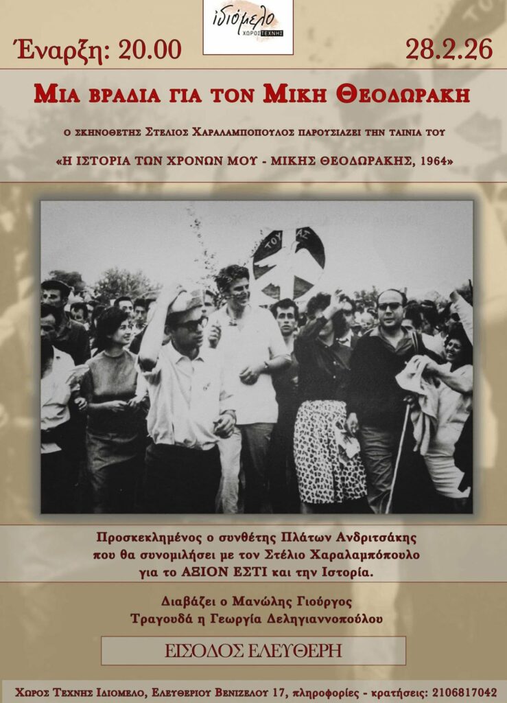 ΜΙΑ ΒΡΑΔΙΑ ΓΙΑ ΤΟ ΜΙΚΗ ΘΕΟΔΩΡΑΚΗ ΣΤΟ ΙΔΙΟΜΕΛΟ ΣΤΙΣ 28/2 ΔΙΑ ΧΕΙΡΟΣ ΣΤΕΛΙΟΥ ΧΑΡΑΛΑΜΠΟΠΟΥΛΟΥ