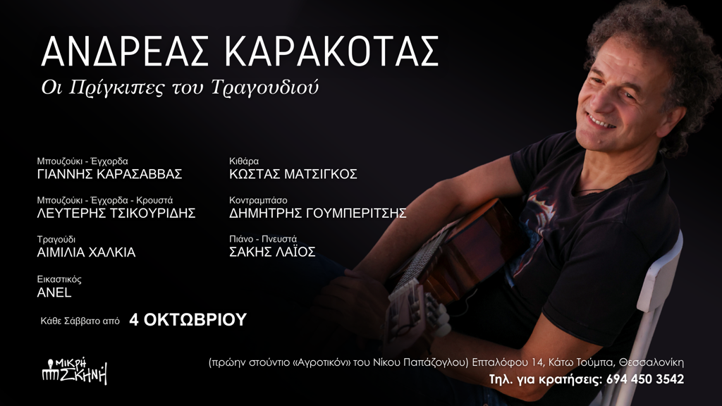 ΜΙΚΡΗ ΣΚΗΝΗ “ΟΙ ΠΡΙΓΚΙΠΕΣ ΤΟΥ ΤΡΑΓΟΥΔΙΟΥ” ΑΝΔΡΕΑΣ ΚΑΡΑΚΟΤΑΣ ΑΠΟ ΤΟ ΣΑΒΒΑΤΟ 4/10 ΚΑΙ ΚΑΘΕ ΣΑΒΒΑΤΟ ΜΕΧΡΙ 27/12