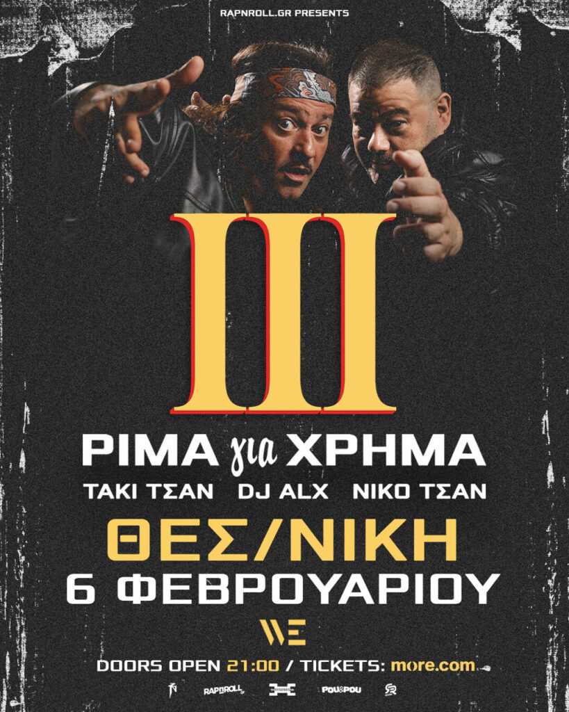 Ο ΤΑΚΙ ΤΣΑΝ και ο DJ ALX, μαζί με τον ΝΙΚΟ ΤΣΑΝ, μπαίνουν στο van του rapnroll.gr και ξεκινάνε το «ΡΙΜΑ για ΧΡΗΜΑ ΙΙΙ» TOUR με πρώτη στάση την Θεσσαλονίκη, την Παρασκευή 6 Φεβρουαρίου στο WE.