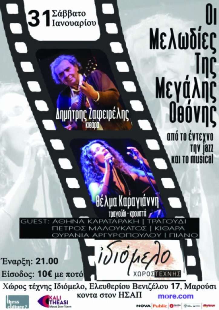 Ο Δημήτρης Ζαφειρέλης στην κιθάρα και η Θέλμα Καραγιάννη στο τραγούδι μας προσκαλούν στις ‘Μελωδίες της Μεγάλης Οθόνης’ για να απολαύσουμε μαζί τους μια ευχάριστη βραδιά αφιερωμένη στα τραγούδια και την μουσική από το Ελληνικό και ξένο ρεπερτόριο που έχουν ακουστεί και στον κινηματογράφο.