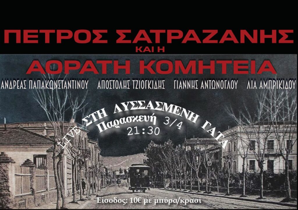 Ο Πέτρος Σατραζάνης και η Αόρατη Κομητεία εμφανίζονται στη Λυσσασμένη Γάτα την Παρασκευή 3 Απριλίου.