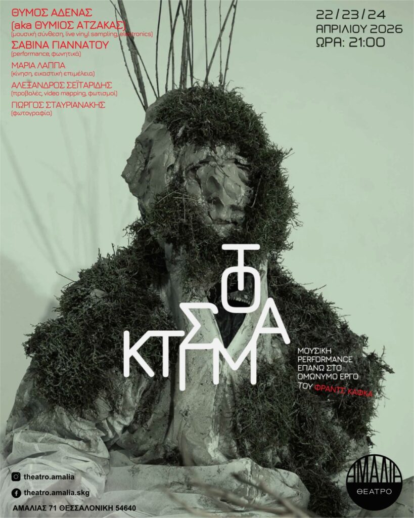 | Το «Κτίσμα», από τα τελευταία κείμενα που άφησε ο Φραντς Κάφκα πριν τον θάνατό του (1923 – 1924), μετά από τις sold out εμφανίσεις στην Αθήνα, παρουσιάζεται, για πρώτη φορά ως μία μουσική περφόρμανς, στη Θεσσαλονίκη, στις 22, 23, 24 Απριλίου στο Θέατρο Αμαλία, αποδίδοντας το κείμενο ως ένα ζωντανό συμβάν ήχου και σώματος. |