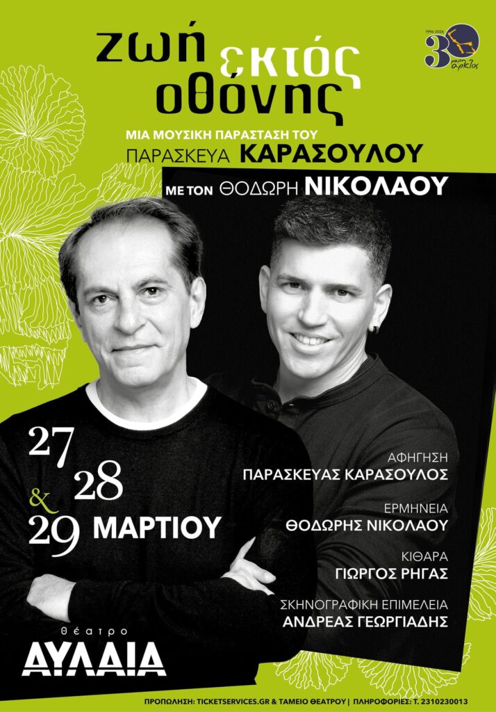Η μουσική παράσταση, Εκτός Οθόνης, που επιμελήθηκε ο Παρασκευάς Καρασούλος παρουσιάζεται στη Θεσσαλονίκη στο θέατρο Αυλαία στις 27, 28 και 29 Μαρτίου, με τον σπουδαίο ερμηνευτή Θοδωρή Νικολάου και τον κιθαρίστα Γιώργο Ρήγα.