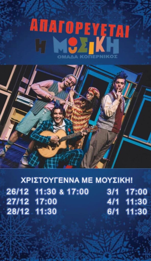 Η παιδική σκηνή του θεάτρου ΑΥΛΑΙΑ και η εταιρία παραγωγής ΓΙΝΟΝΤΑΙ ΕΡΓΑ, ξεκίνησαν φέτος μια όμορφη καλλιτεχνική συνεργασία με την – γνωστή στο χώρο του θεάτρου για παιδιά – ομάδα ΚΟΠΕΡΝΙΚΟΣ και ανέβασαν, για το κοινό της Θεσσαλονίκης, τη μεγάλη θεατρική επιτυχία: «ΑΠΑΓΟΡΕΥΕΤΑΙ Η ΜΟΥΣΙΚΗ» που συνεχίζει το ταξίδι της και στις γιορτές!