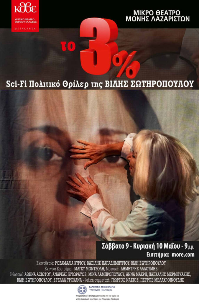 | ΜΕΤΑΚΛΗΣΗ Το ΚΘΒΕ παρουσιάζει «Το 3%»της βραβευμένης Βίλης ΣωτηροπούλουΈνα Sci–Fi πολιτικό θρίλερ με υποδόριο χιούμορκαι κινηματογραφική ματιά Μικρό Θέατρο Μονής Λαζαριστών Σάββατο 9 και Κυριακή 10 Μαΐου 2026 |