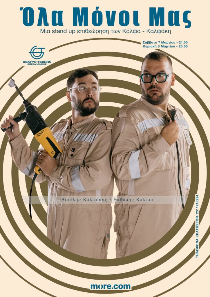 Η stand up επιθεώρηση «Όλα Μόνοι Μας» των Κάλφα–Καλφάκη που ξεκίνησε τον Δεκέμβρίο του 2025 στο Θέατρο 104 για τέσσερις παραστάσεις και έκτοτε μετρά απανωτά sold out ΕΡΧΕΤΑΙ με τρομερή διάθεση στο Θέατρο Τεχνών Θεσσαλονίκης για δύο (2) μοναδικές παραστάσεις! Με το βλέμμα στραμμένο στην σουρεαλιστική πραγματικότητά μας, το κωμικό δίδυμο φέρνει στη σκηνή μια σατιρική παράσταση με γέλιο, τραγούδι, κοστούμια και χορό. Ένα χειροποίητο θέαμα, τόσο γνήσιο, που ο κάθε θεατής θα αναγνωρίσει μέσα του κομμάτια της δικής του καθημερινότητας.