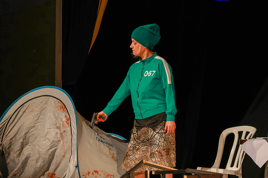Ιδιαίτερα εύγλωττη είναι και η παρουσία του αντίσκηνου στο προσκήνιο: ένα πρόχειρο καταφύγιο που παραπέμπει σε προσωρινή διαμονή, σε επιβίωση αντί για ζωή. Το σώμα που κείται εντός του, συχνά σχεδόν αδρανές, μετατρέπει τον χώρο σε τόπο εγκατάλειψης, σε εικόνα κοινωνικής και συναισθηματικής αστεγίας. Το αντίσκηνο, σύμβολο ελευθερίας ή περιπλάνησης, εδώ απογυμνώνεται από κάθε ρομαντισμό και γίνεται σήμα αδιεξόδου