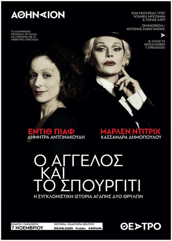 Το μιούζικαλ των Ντάνιελ Μπόϋμαν και Τόμας Κάρυ «Ο Άγγελος και το Σπουργίτι», η συγκλονιστική ιστορία αγάπης μεταξύ των δύο θρύλων της σκηνής, της Μαρλέν Ντίτριχ και της Εντίθ Πιάφ, ζωντανεύει για πρώτη φορά στην Ελλάδα σε σκηνοθεσία Αντώνη Καραγιάννη, στο ανανεωμένο Θέατρο Αθήναιον από την Παρασκευή 7 Νοεμβρίου 2025 και για περιορισμένο αριθμό παραστάσεων.