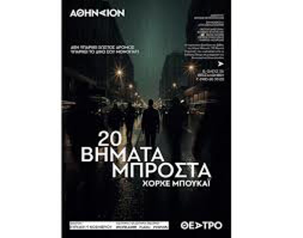 Το παγκόσμιο best seller «20 Βήματα Μπροστά» του Χόρχε Μπουκάι παρουσιάζεται δραματοποιημένο, για πρώτη φορά στην Ελλάδα, σε διασκευή Παύλου Μητσόπουλου και σκηνοθεσία Άγγελου Κλωνάρη στη σκηνή του ανανεωμένου θεάτρου Αθήναιον από την Κυριακή 9 Νοεμβρίου 2025, για περιορισμένο αριθμό παραστάσεων.