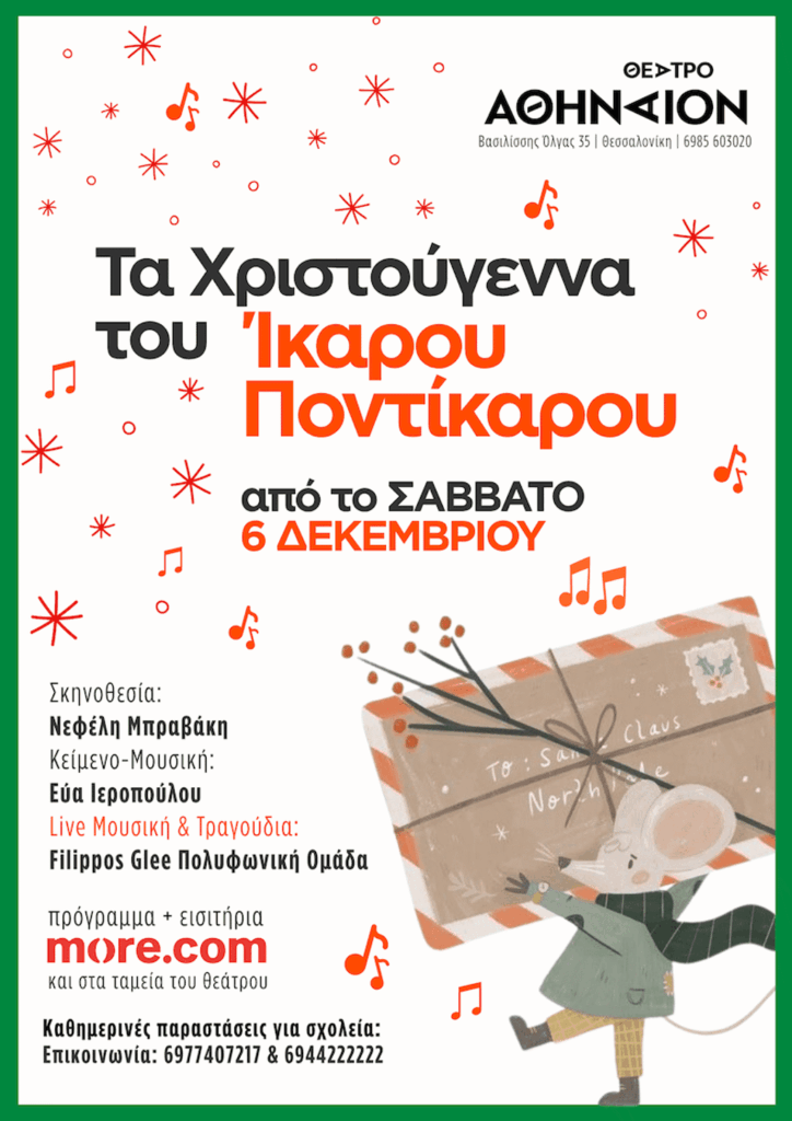 Ο αγαπημένος Ίκαρος Ποντίκαρος επιστρέφει με μια εντελώς νέα ιστορία, καινούρια τραγούδια και πολλή χριστουγεννιάτικη μαγεία! Μια ολοκαίνουργια παιδική μουσικοθεατρική παράσταση, κατάλληλη για παιδιά από 4 ετών, παρουσιάζεται από 6 Δεκεμβρίου 2025 έως 6 Ιανουαρίου 2026, στο ανανεωμένο Θέατρο Αθήναιον.