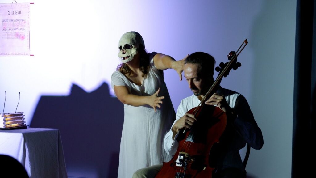 Σε έναν χώρο απομόνωσης και δημιουργίας, ένας Ποιητής συνομιλεί με μια παράδοξη παρουσία: Ένα κρανίο που μοιάζει να επιστρέφει από τη λήθη. Ανάμεσα στους δύο αναπτύσσεται ένας υπαινικτικός σκηνικός διάλογος όπου η μνήμη, η φθορά και η επιθυμία διασταυρώνονται.
