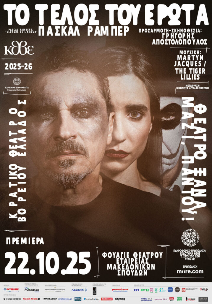 ΝΕΑ ΠΑΡΑΓΩΓΗ «Το τέλος του έρωτα» του Pascal Rambert Προσαρμογή – Σκηνοθεσία: Γρηγόρης Αποστολόπουλος Mουσική: Martyn Jacques/ The Tiger Lillies ΠΡΕΜΙΕΡΑ Τετάρτη 22 Οκτωβρίου 2025 ΦΟΥΑΓΙΕ ΘΕΑΤΡΟΥ ΕΤΑΙΡΕΙΑΣ ΜΑΚΕΔΟΝΙΚΩΝ ΣΠΟΥΔΩΝ |