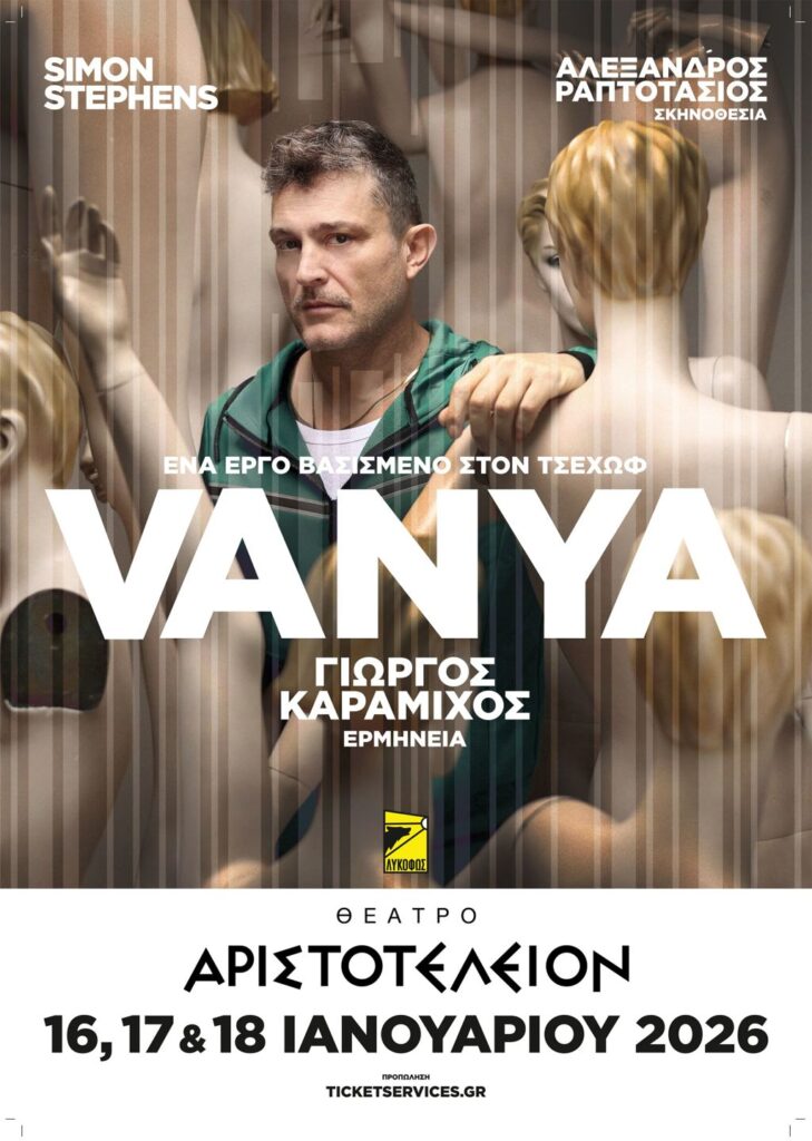 Ο σημαντικός Έλληνας ηθοποιός αναμετράται επί σκηνής, υπό τη σκηνοθετική καθοδήγηση του Αλέξανδρου Ραπτοτάσιου, με τον “VANYA” του πολυβραβευμένου Simon Stephens, ιδιαίτερα αγαπητού στη χώρα μας από το σπουδαίο θεατρικό του έργο “Ποιος σκότωσε τον σκύλο τα μεσάνυχτα”. Η σύγχρονη και συμπυκνωμένη εκδοχή του γνωστού έργου του Αντόν Τσέχωφ, προκαλεί έναν ηθοποιό να υποδυθεί οκτώ ρόλους, ακροβατώντας ανάμεσα στην κωμωδία και την τραγωδία χαρακτήρων που θέλουν απεγνωσμένα να αλλάξουν τις ζωές τους.