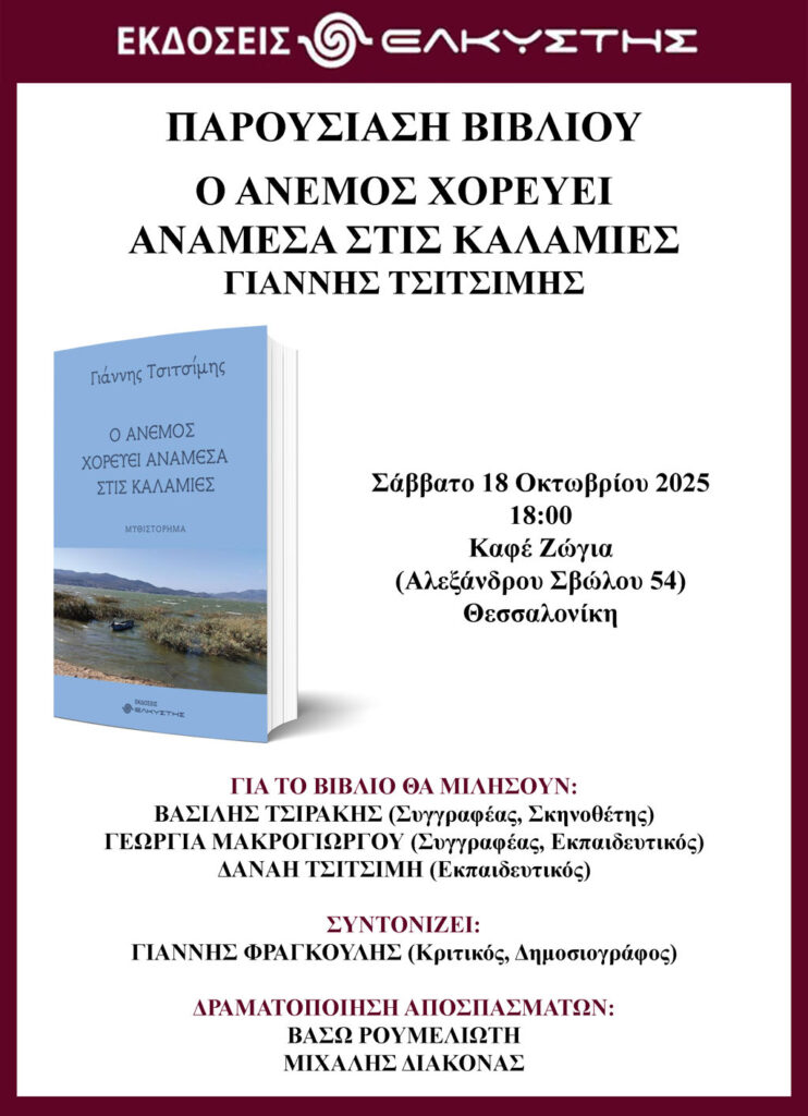 ΒΙΒΛΙΑ ΠΑΡΟΥΣΙΑΣΗ ΤΟΥ ΒΙΒΛΙΟΥ “Ο ΑΝΕΜΟΣ ΧΟΡΕΥΕΙ ΑΝΑΜΕΣΑ ΣΤΙΣ ΚΑΛΑΜΙΕΣ” ΤΟΥ ΓΙΑΝΝΗ ΤΣΙΤΣΙΜΗ By ΚΑΤΕΡΙΝΑ ΧΑΤΖΗΚΩΝΣΤΑΝΤΙΝΟΥ 4 October 2025 7 Tags: "Ο ΑΝΕΜΟΣ ΧΟΡΕΥΕΙ ΑΝΑΜΕΣΑ ΣΤΙΣ ΚΑΛΑΜΙΕΣ" Share: